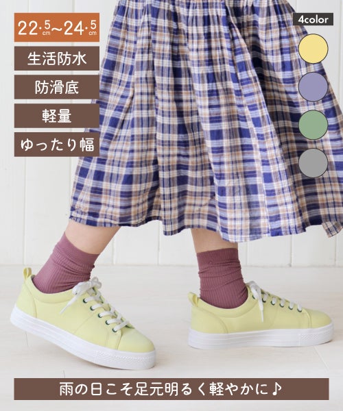 防水防滑加工のあるシューズは、特に雨の日、雪の日などのお出かけに活躍します。デザインがさりげなくてふだん使いできるシューズを選べば、急な雨降りにも対応できますし、雨上がりも浮かずにおしゃれを楽しめます。