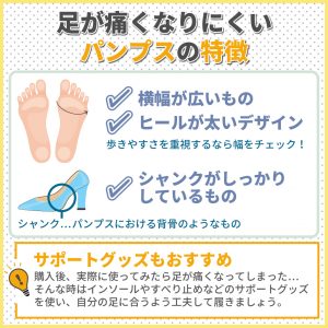 装着して歩くと、それほど強い痛みを感じることがないでしょう。このようにできるだけ痛みを感じなくて済むように、たくさんのサポートグッズが販売されています。使わずにお気に入りのパンプスを捨てるのはもったいないと感じるのであれば、サポートグッズの活用も検討してみましょう。
