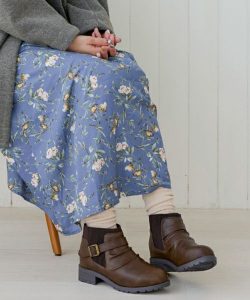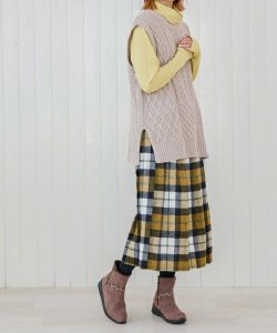 スカートを履く際には、体感温度を上げるように意識して足元は徹底的に温かくしましょう。できれば膝が隠れるくらい長い丈のスカートにぴったりしたタイツとレッグウォーマー、そしてブーツで足を包み込み温活します。