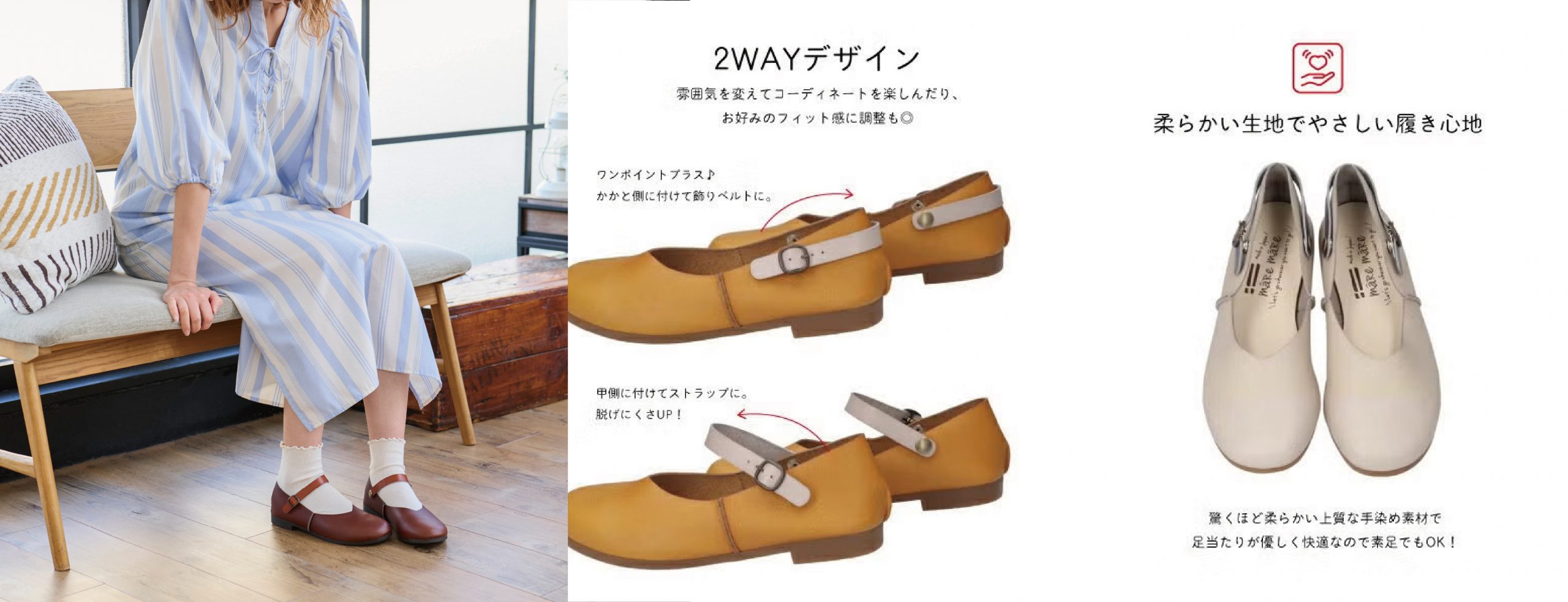 かかと部分に位置を変えると飾りベルトにすることもできる2WAYデザイン