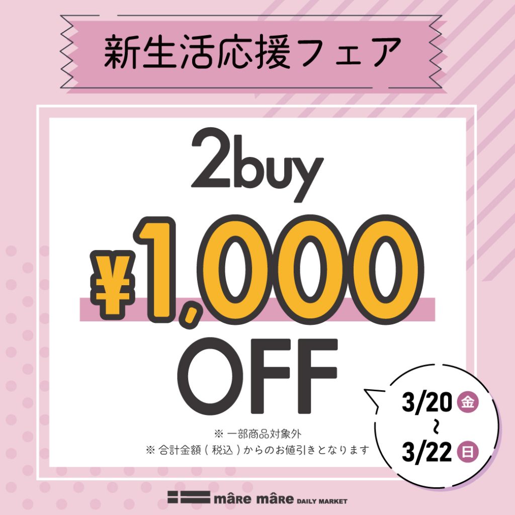 新生活に向けたおまとめ買いフェアを開催いたします。 ■ 内容 対象商品を2足以上お買上で、レジにて1,000円OF[…]